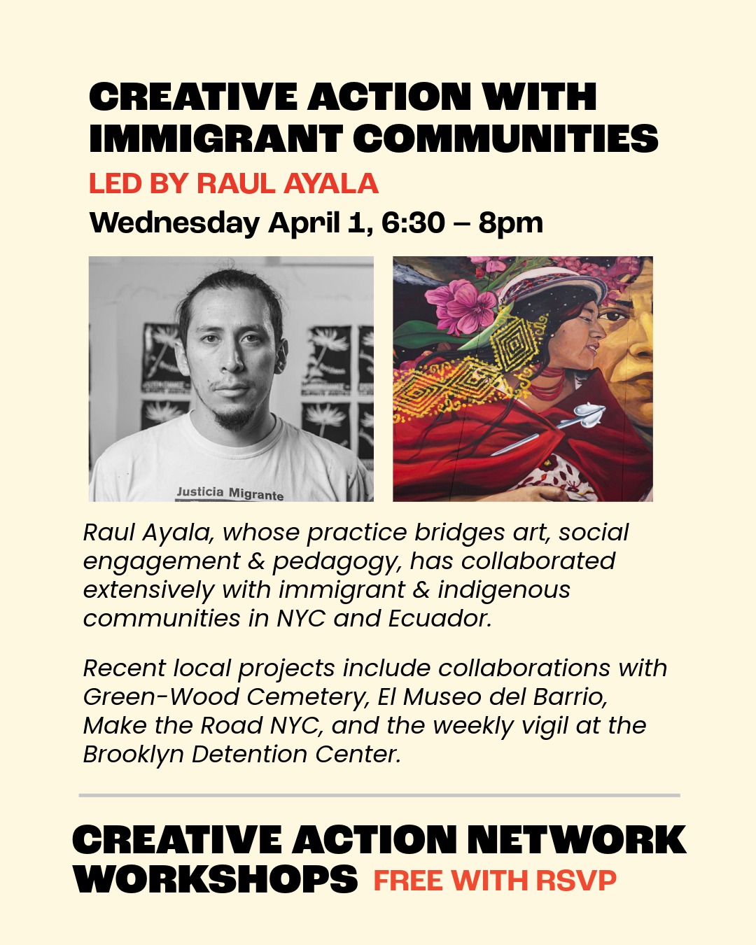 Raul Ayala’s practice bridges art, social engagement, and pedagogy through large-scale paintings, site-specific installations, collaborative murals, performance, and other public interventions. Raul has an extensive history collaborating with immigrant and indigenous communities on installations, murals, community ritual, and direct action campaigns in NYC and Quito, Ecuador.